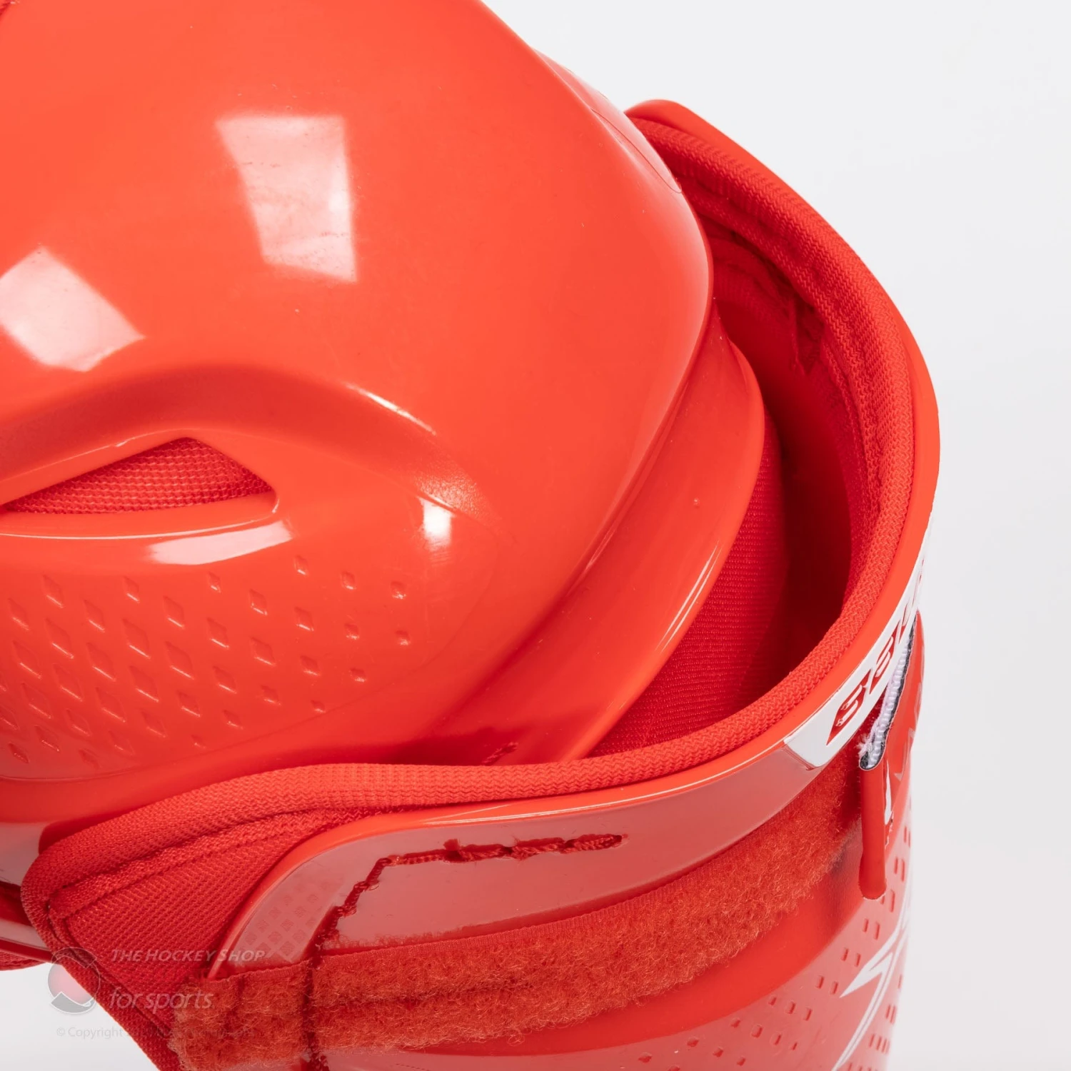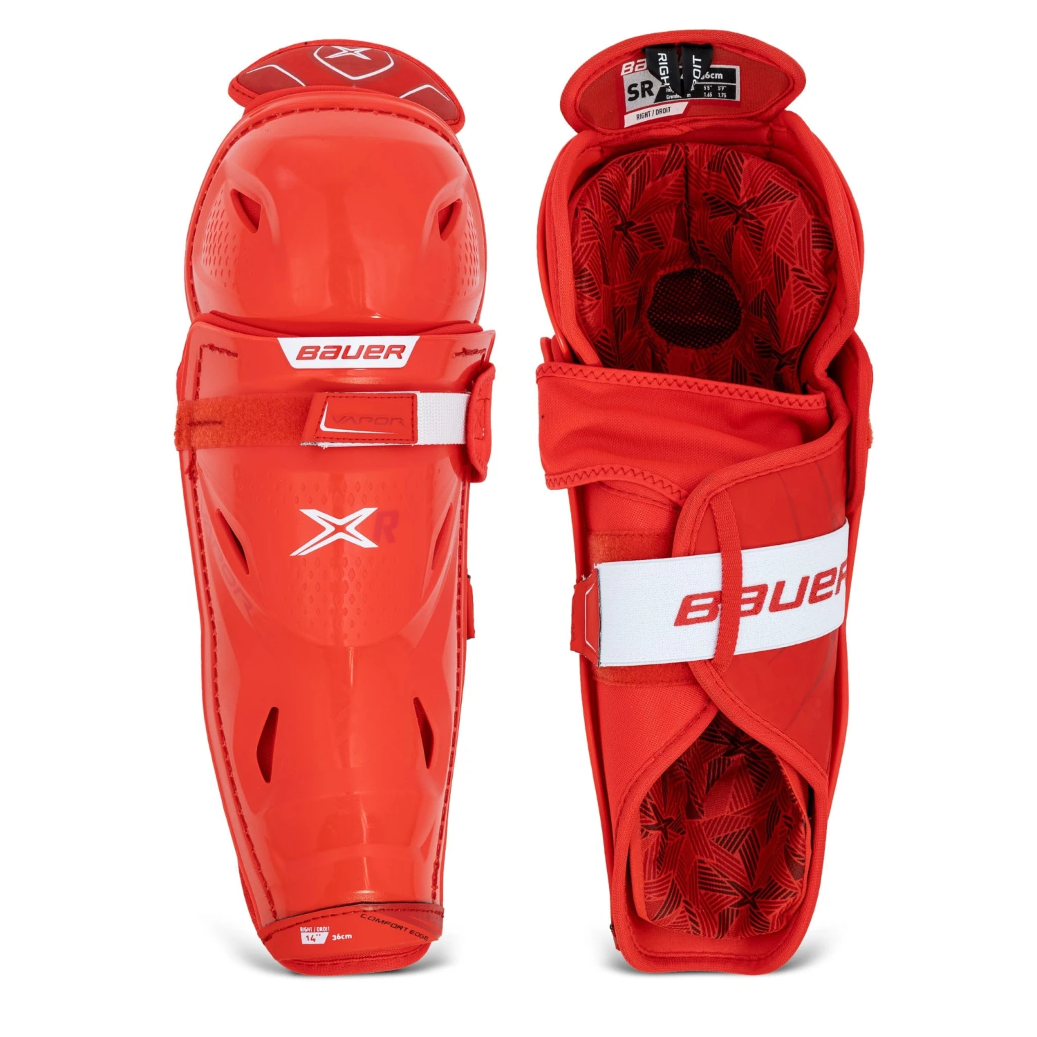 The Vapor X-R Protective line-up is a unique product launch from Bauer, featuring a bright red base with white highlights. The X-R shin guard features X-LITE SHIELD protection in the shin cap with deep fitting knee caps. Also featured is additional protection with a side knee wing, flexible thigh protector and molded calf guard. Finished with THERMO MAX liner and lock strap for comfort and securing, the X-R shin pad delivers protection, comfort, and lots of personality.