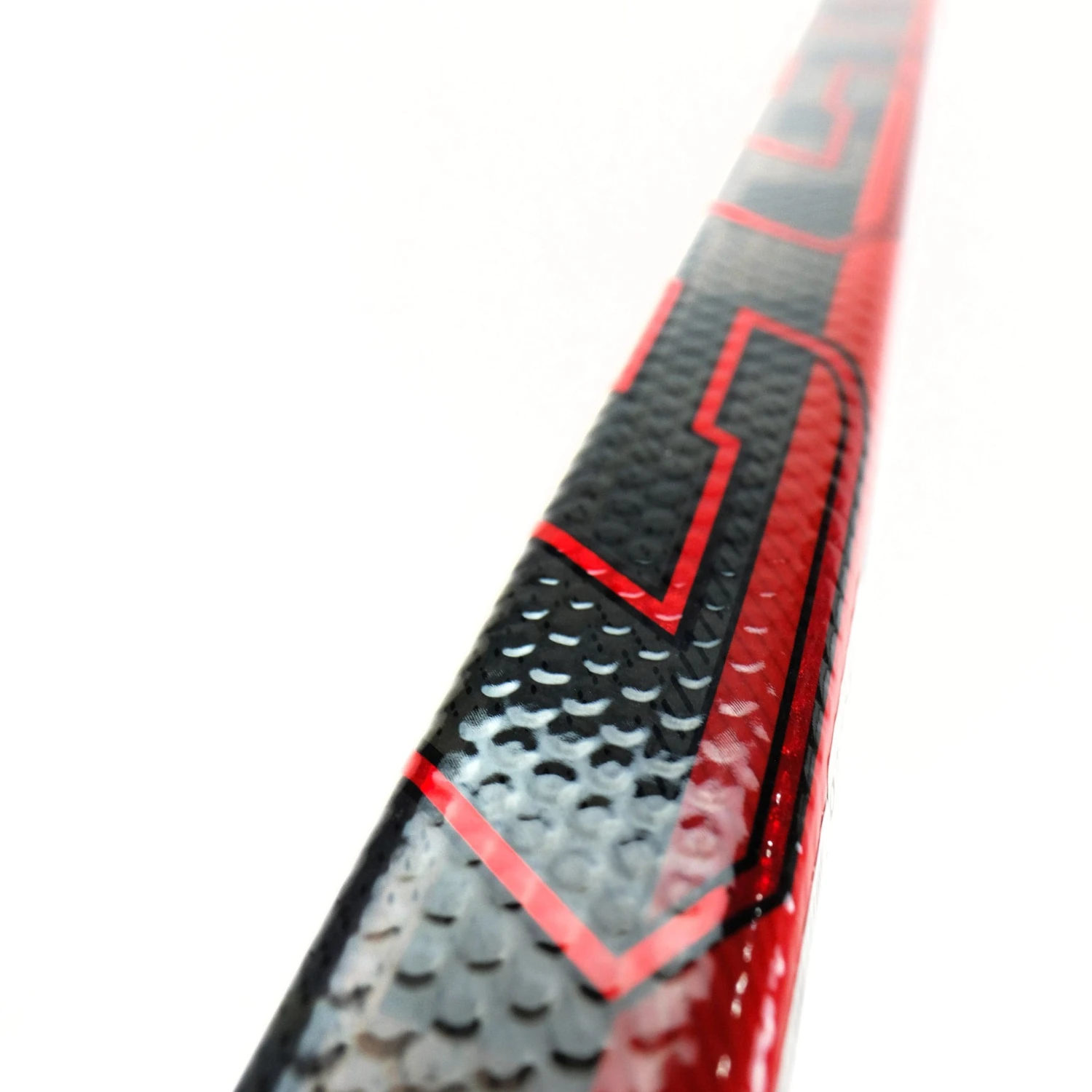 This custom CCM Jetspeed FT4 Pro Stock Senior Hockey Stick offers a few key features that differentiate itself from the original Jetspeed FT4 Pro. This stick is equipped with an abrasive finish on the max height blade. the curve is a custom P19M curve and a unique toe shape that is round with a square bottom. The shaft is outfitted with a tactile grip that resembled the dimples on a golf ball.