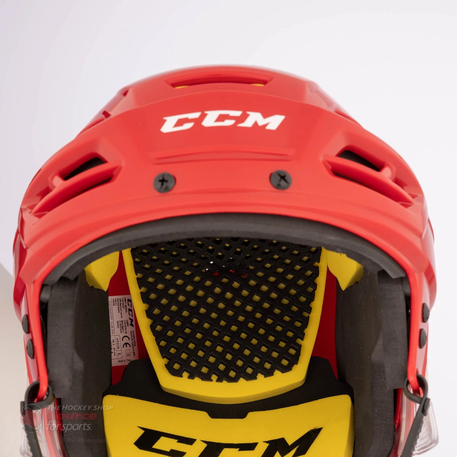 The CCM Tacks 210 Hockey Helmet comes in sizes Small through Large, and is available in Black, White, Navy, Royal, and Red.